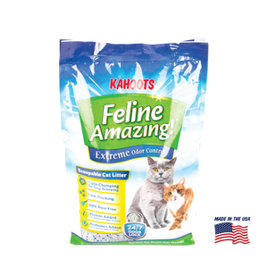 Kahoots Feline Amazing! Extreme Odor Control cat litter utilizes Zeolite and 5 strains of active probiotics that go to work when your cat goes, attacking any and all odor causing bacteria as they form. For complete odor elimination, 24 hours a day, seven days a week, this super premium litter is the one for you (especially if you have a multi-cat household). Made and sourced in the USA.