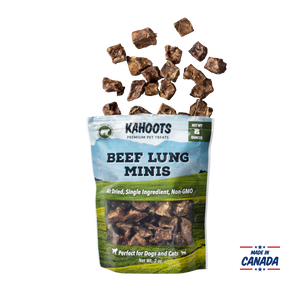 When researching a new product, our primary goal is to provide a sustainably sourced, all-natural, and wholesome offering that's convenient for the whole family. Kahoots' new Minis are the perfect bite-sized snack or training treat for both cats and dogs. All Kahoots Minis are non-GMO, single-ingredient, single-source, and loaded with natural benefits...want a soft and shiny coat while cutting down on hairballs? A natural boost of essential B vitamins? Or a healthy zing of protein to pump up the energy? These Beef Lung Minis have it all! (2 oz bag)