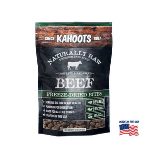 Introducing Kahoots Freeze Dried Beef, Pork, & Turkey Formulas, proudly crafted in the USA for dogs of all ages. Our mission is to provide premium raw nutrition that's both affordable and nourishing. Made with carefully selected ingredients, these formulas are GMO-free, gluten-free, and naturally rich in Omega-3s. Serve as a full meal or a delicious topper, and give your dog the gift of a balanced diet. Each 16 oz bag is a testament to quality and care, right from our backyard.