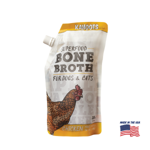 The primary protein in bone broth is collagen which is the vital building block of a healthy skin & coat, as well as mobile joints. It also soothes the intestines for better digestive and immune health. Bone broth is 99% water, so hydration is a major benefit for dogs & cats. Bone broth contains the amino acid glycine, which may promote relaxation and deeper, more restorative sleep. Bone broth rich flavor and high water content help pets to feel full and satisfied even on a reduced calorie diet. It’s a great way to add flavor with negligible fat and calories.